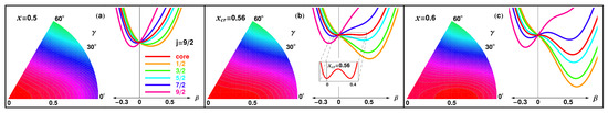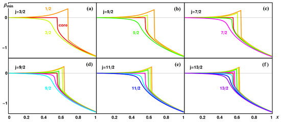 The evolution of the equilibrium deformation parameter for the fermionic states and the bosonic case along the transitional path from spherical to oblate shape is illustrated in Figure 15. As seen in fourth panel (d) of Figure 15 for the case of , the states with always favor oblate shapes, while states with the lower are prolate up to their specific critical x values. After these values, they suddenly jump from prolate to oblate shapes. They present two degenerate minima for these values and as a result the components with lower K’s show first-order phase transitions. On the contrary, in the case of phase transitions along the U(5) → SU(3) path, as illustrated in the first panel of Figure 13, the states that show first order characteristics are those with higher . As seen in the panels of Figure 15 for the different single-j from to , the lower K states always prefer to be prolate up to their specific critical point, then they jump to oblate shape at these specific x values, while the higher K states always prefer oblate shapes along the full transitional path. In the well deformed oblate region, close to , once again we see that the oblate core drives all states to the oblate shape, with approximately the same .