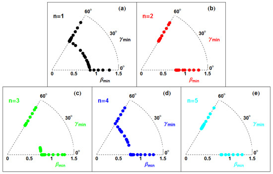 For the complete analysis of the absolute minimum evolution for each n-state, polar plots in the plane are presented in Figure 17. Each panel corresponds to a different n-state and the and values provide the absolute minima of the energy surface for different -values. It is clearly seen that the five components of the orbital seem to show quite interesting and unexpected behavior. Two odd-states () move slowly from the prolate () to the oblate () shape by venturing into the triaxial region, showing -softness around their slow shape-changing region. The other three odd-states () show sudden jumps (critical point) at some from prolate side to oblate side without passing through triaxial structures what generates shape coexistence, although one of them () is fairly close to -instability. Of course, care has been used here to ensure that the jump is not a numerical artifact due to scales changing too slowly or too rapidly.