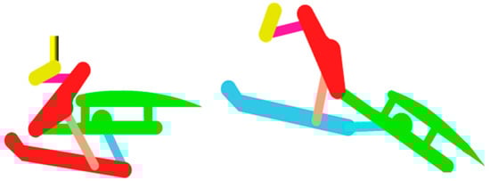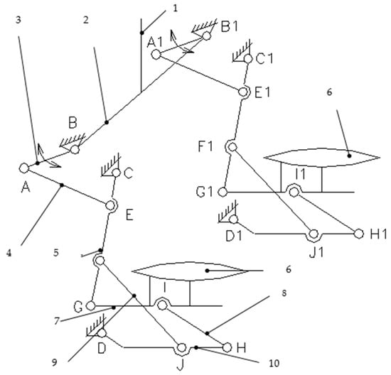 From the kinematic actuators 4, 16, the movement is transmitted to the kinematic actuator 5 through the rotational couplings in E and E1, the kinematic actuator 5 elements being connected to the bases by the rotational couplings in C and C1. These five bodies have three links (rotation couplings E, F, G, E1, F1, G1, respectively) and bases C and C1, respectively. The rotational couplings in F and F1 provide the connection between bodies 5 and bodies 9, and the rotation couplings in G and G1 provide the connection with the output bodies 6 (the endless curvature of the escape board, the asymmetric profile flap).