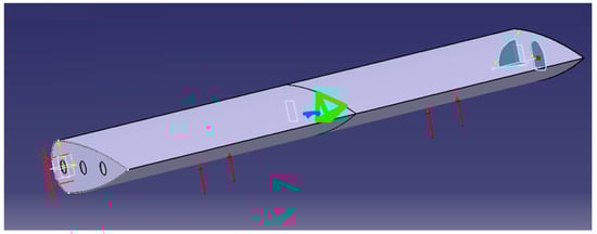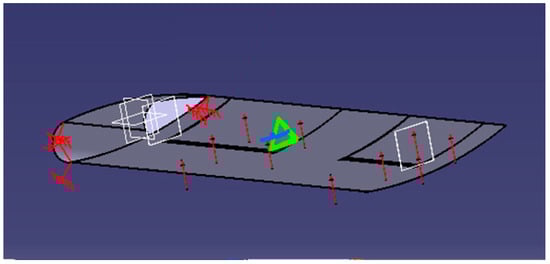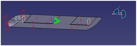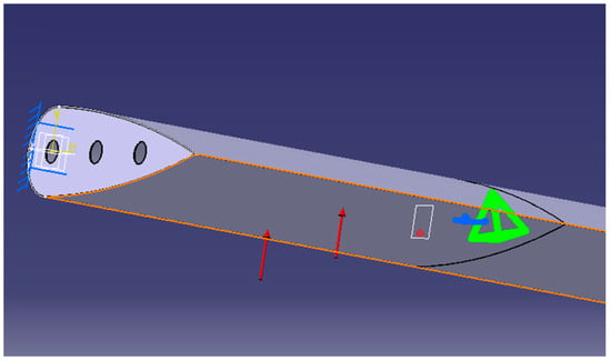 To generate the model, the finite element method is performed, which involves the static analysis of the structure under conditions of imposed constraints and independent time loads. The link with the base imposed on the model is defined by canceling the 6 degrees of possible freedom associated with the lateral surface of the wing (Figure 9) [].