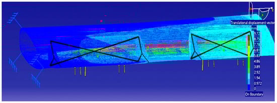 The displacement field is calculated, the maxim displacement being 0.106 mm. The results of Equivalent Von Misses stress is visualized in Figure 13, the maxim value being 2.63 × 106 N/m2.