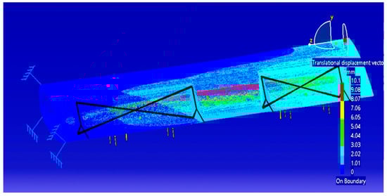 The loading of the model is a uniform pressure after the Y-axis on the face of the wing. The model solution is offered by soft. The displacement field of the wing with a symmetrical profile from duralumin is presented in Figure 9, the maxim displacement being 9.72 mm.