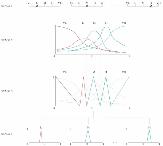 The proposed method assumes the conversion of the measurement results in triangular fuzzy numbers because they are most often used in the fuzzy TOPSIS. The conversion method was divided into four stages, as shown in Figure 1.