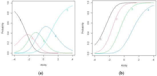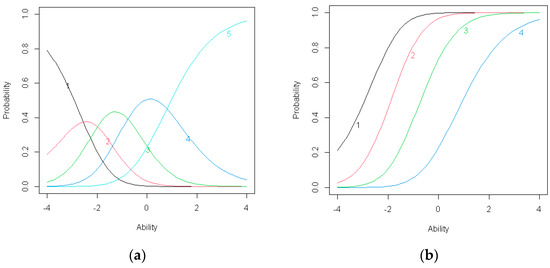In IRT models, thresholds are defined as boundaries between adjacent scores and serve as successive “steps” in an item response process. The concept of threshold is key element in polytomous Likert-type scaling (like 5—point ordinal scale) where two types of probabilities can be distinguished: (a) probability of passing a category boundary threshold (item step), and (b) probability of responding in the next category of scale. So, thresholds are also sometimes referred to as category boundaries, which separate the ordered response categories. The definition and modelling of category boundaries depends on the type of polytomous IRT model. In the family of graded response model (GRM) the cumulative model is used, whereas in Rasch-type model (Polytomous Rasch Model (PRM), Partial Credit Model (PCM), and Rating Scale Model (RSM)), the adjacent category model is preferred [24]. Therefore, the concept of threshold and interpretation of location parameter depends on applied model.