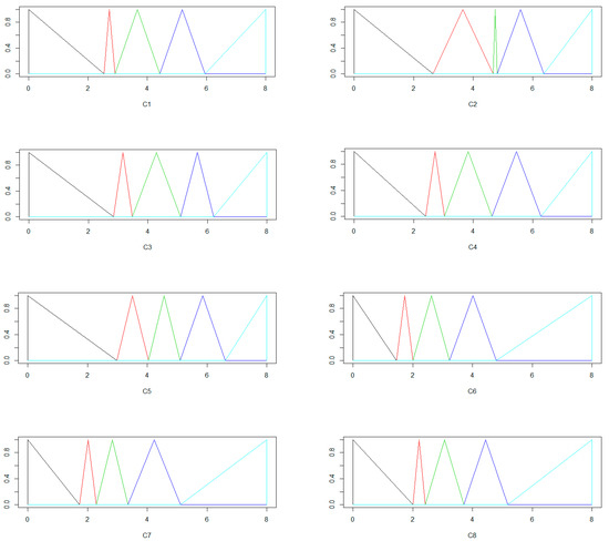 The parameters of triangular fuzzy numbers should be estimated separately for each of the partial criteria. It is easy to notice that some parameters of the triangular fuzzy numbers that replace the extreme categories are arbitrarily set at the level of −4 and 4. This procedure allowed for both the left and right limitation of the measurement scale. The adopted values result from the fact that in IRT models, the hidden variable continuum is often limited to the range <−4; 4>. It should also be emphasized that the parameters of triangular fuzzy numbers can be scaled by a selected constant value set arbitrarily by the researcher.