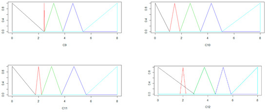 The fuzzy conversion scales used with the fuzzy TOPSIS most often have five points (categories) represented by five triangular fuzzy numbers. The 6-point and 7-point scales are used less frequently (see, e.g., [7,8]). The values of the parameters of triangular fuzzy numbers differ from study to study. There are also differences in the spread of triangular fuzzy numbers. In the studies [9,10], the triangular fuzzy numbers’ lower and upper limit values are in the interval <0; 1>. In both studies, the spreads of fuzzy numbers for extreme categories differ from the others. Triangular fuzzy numbers assigned to the remaining categories are symmetric and have the same spread. In the study [10], the spreads of adjacent fuzzy numbers overlap to a greater extent. A similar fuzzy conversion scale was used in the study [11]. The difference concerns the middle category, where the triangular fuzzy number has the largest spread compared to the other triangular fuzzy numbers. Another proposal for a fuzzy conversion scale is presented in [12]. The lower and upper limit values of triangular fuzzy numbers belong to the interval <0.1; 0.9>. Triangular fuzzy numbers are symmetric except in the extreme categories. However, the scale is distinguished because the ranges of triangular fuzzy numbers do not overlap.