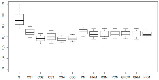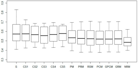 Establishing the reference objects’ coordinates based on the maximum and minimum values (depending on the nature of the criteria) had a strong influence on the results of the fuzzy TOPSIS. The basic difference is the greater ranges of variation in the closeness coefficients’ values for fuzzy conversion scales (especially for those obtained based on IRT models). Another method of determining the coordinates of reference objects clearly improved the discriminant power of the fuzzy conversion scales proposed in the article. The exception was the results of the fuzzy TOPSIS for the scale obtained with the use of the NRM model. In this case, the range of variability of the closeness coefficient value was smaller than in other scales. The median value was also lower, as was the coefficient’s value for the highest-rated object. The change in the reference objects’ coordinates also affected the fuzzy TOPSIS results for the CS1–CS5 fuzzy conversion scales. The range of variability of the values of the closeness coefficients for these scales also increased. However, it is smaller than in scales based on IRT models, which proves their lower discriminant abilities. In this case, the lowest-rated objects have higher values of closeness coefficients than in scales built on IRT models. The values of the closeness coefficient for the S scale with the classic TOPSIS method responded most strongly to the change in coordinates of the reference objects. The range of variability of the closeness coefficient has significantly increased (the lowest-rated objects now have significantly lower values than in the previous case). Other coordinates of reference objects influenced asymmetry in the distributions of the closeness coefficient values for some fuzzy conversion scales. For the scales based on the RSM, PCM, GPCM, and GRM models, a small right-skewed distribution of the closeness coefficient values was observed. Moderate right-skewed distribution was observed for the S and NRM scales. In other cases, we can assume that the distributions were symmetric.
