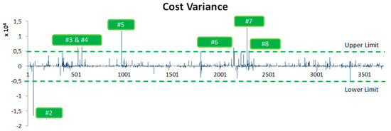 This section focuses on demonstrating the results after the description of the new E-EVM model in Section 4. As indicated, this is a simulation of a big aerospace project where the WBS has been disaggregated into 4000 subprojects. The projects are measured in hours as the unit cost which allows us to know the times without using the ESM [5,6,7], EDM [8], or EVM [9] models.