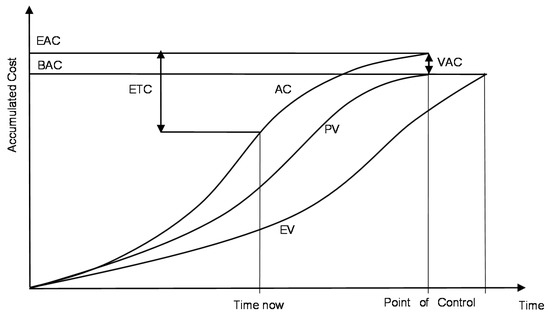 The main acronyms and definitions of EVM are given in the Practice Standard for Earned Value Management of PMI [46]. Additionally, this model provides a projection of the so-called Estimate at Completion (denoted by EAC) which may differ from the original project budget, called the Budget at Completion (BAC). That parameter allows analysis of the PV by means of an estimate of the cost (AC) and schedule estimation (derived from EV) from the current time. Three different ways to compute EAC: