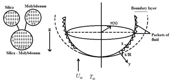 Herein, we investigate the viscous, laminar, incompressible combined convection motion around a sphere. Here R is the sphere size. Let Tw and T∞ be the temperature at the border and away from the surface. The geometry and the configuration of the flow system are schematically presented in Figure 1. Here x is the curvilinear coordinate over the sphere border, while coordinate y is perpendicular it. The section r(x) explains the contour of the considered object.