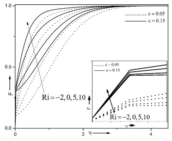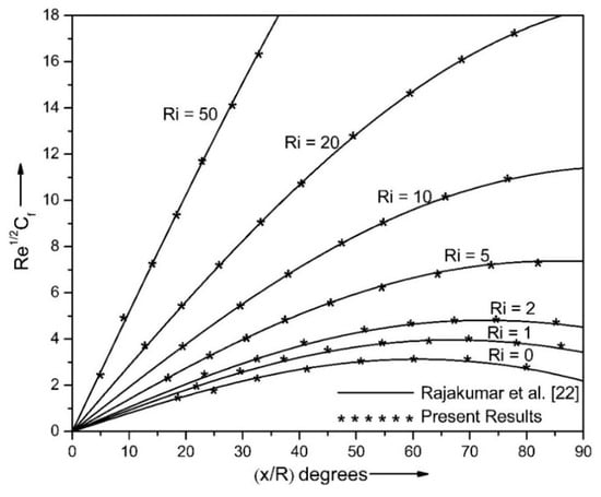 To verify the accuracy of the computational approach, the obtained outcomes found for several values of Ri, by setting all characteristics values to zero except Pr = 0.7 are compared with the outcomes of Rajakumar et al. [] in Figure 17 and it is obtained that the outcomes are well agreed.