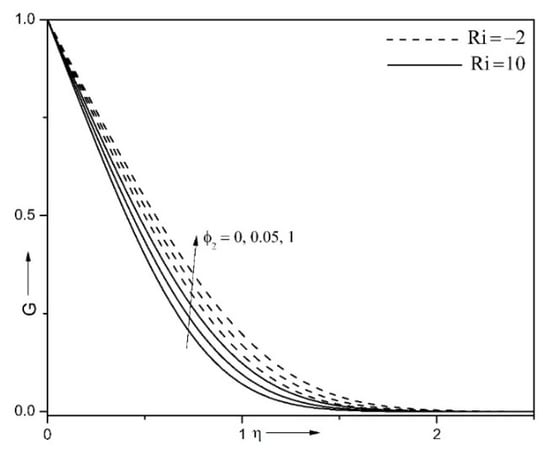 Figure 3 displays the impact of combined convection parameter (Ri) and volume fraction (φ2) on temperature distribution . For enhancing values of combined convection characteristic, the temperature of the liquid diminishes. The difference between the wall temperature and ambient flow temperature increases, for increasing values of Ri, which reduces the fluid temperature. Further, for escalating magnitude of volume fraction (φ2), the temperature of the liquid augments. The liquid heat conductivity enhances for enhancing magnitude of volume fraction (φ2) and rises the capacity of the hybrid nanofluid to conduct more heat, which enhances the temperature of the liquid.