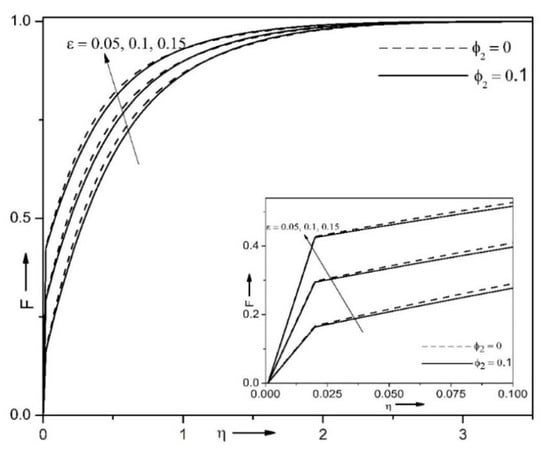 Figure 4 displays the impact of velocity ratio characteristic (ε) and volume fraction (φ2) on velocity profile . For enhancing magnitudes of concentration (φ2) the velocity of the liquid diminishes. It is clear that the velocity of the fluid is larger in absence of nanoparticles compared its presence, for each corresponding value of ε. For increasing values of φ2 the hybrid nanofluid becomes denser and concentrated. Moreover, velocity of the fluid enhances with enhancing values of velocity ratio characteristic. This is caused because the larger value of velocity ratio characteristic indicates more slip at the border that raises the liquid velocity.