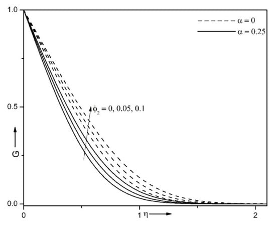 Figure 5 presents the impact of small parameter (α) and volume fraction (φ2) on temperature profile . Temperature of the liquid diminishes with enhance in this small parameter. As we seen that the fluid temperature diminishes more in rough surface (α ≠ 0) case compared to smooth surface (α = 0). Such phenomenon can be explained by the packets of fluid that are captured in the troughs formed owing to the surface roughness. It experiences slip at the wall of the sphere, when the liquid flows about the rough sphere and this enhances the velocity of the liquid. The growth of the liquid velocity yields more fluid movement across the wall of the sphere and this diminishes the liquid’s temperature. In addition, the liquid’s temperature enhances with rise in the volume fraction (φ2). It is very clear that hybrid nanofluid has greater thermal conductivity than that of base fluid. Physically, it means that the nanoparticles with high thermal conductivity allow intensifying the heat transference and an inclusion of such nanoparticles enhances energy transport with a rise of the temperature.
