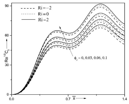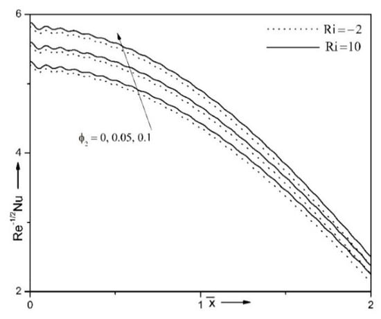 Figure 6 and Figure 7 portray the impact of combined convection characteristics (Ri) and volume fraction (φ2) on surface drag coefficient and energy transport strength . Surface drag coefficient and energy transport strength are enhanced for rising values of combined convection characteristic. The positive magnitudes of Ri illustrate the essential impact of free convection over the forced one. Thus, the buoyancy force inside the liquid intensifies the liquid motion and as a result it augments frictions at the surface. In addition, the drop between the border temperature and free stream temperature enhances for rising values of Ri, which increases the energy transport strength from wall to fluid. Further, for enhancing values of volume fraction (φ2), the friction at the surface and the energy transport strength enhance. This is because addition of nanoparticles in the host liquid leads to intensifying its temperature and as a result one can find an intensification of the energy transport.