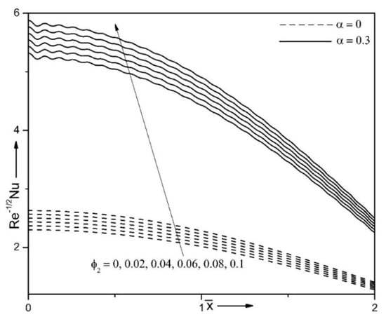 Impact of small parameter (α) and volume fraction of (φ2) on when , Ri = 10, ε = 0.15, n = 10 and φ1 = 0.1.