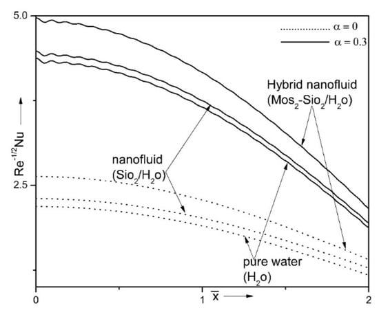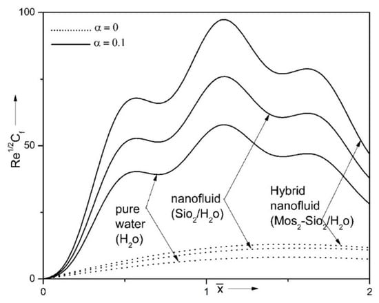 Figure 9 and Figure 10 show the comparison of hybrid nanofluid (MoS2-SiO2/H2O), mono nanofluid (SiO2/H2O) and base liquid (H2O) with various values of small parameter (α) for the surface drag coefficient and energy transport strength . Energy transport strength and coefficient of friction at the border are enhanced for hybrid nanosuspension compared to mono nanofluid and regular liquid. In addition, the friction and rate of heat transfer high for rough surface (α ≠ 0) case compared to smooth surface (α = 0) and sinusoidal waves are seen in presence of rough surface (α ≠ 0). Hence, we can conclude that the hybrid nanofluid has more thermal conductivity than that of nanofluid and base fluid due to the rising magnitudes of nanoparticles concentration fundamentally designate the quicker heat transmission from surface of the cylinder to ambient fluid, this boosts the thermal conductivity and consequently temperature of hybrid nanofluid, which causes the intensive enhance in the magnitudes of temperature profile and rate of heat transfer coefficient, significantly.