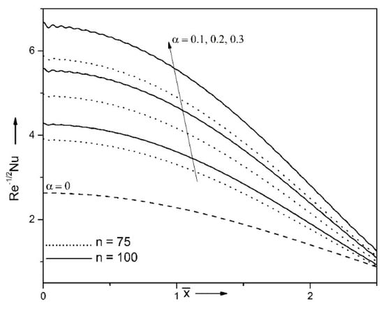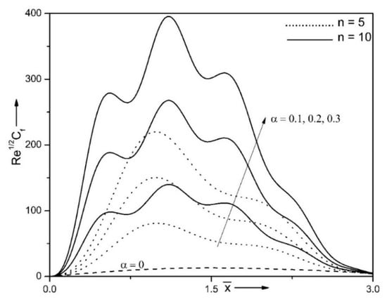 Figure 11 and Figure 12 exhibit the impact of α and n on surface drag parameter and energy transport strength . Coefficient of friction at the surface and the Nusselt number are enhanced for enhancing values of frequency parameter and non-zero values of small parameter (α ≠ 0). It is highlighted that, for regardless magnitudes of frequency coefficient the lines merge all together in smooth surface (α = 0) case. The sinusoidal variations are observed in rough surface (α ≠ 0) case. The amplitude of the sinusoidal waves enhances with intensifying values of small parameter, while the number of sinusoidal variations enhances as rise in n. Hence, the roughness of the surface has an essential influence on the liquid motion in comparison to the smooth surface. In addition, at and n = 100, the friction at the surface enhances about 55%, when α varies from 0.1 to 0.3.