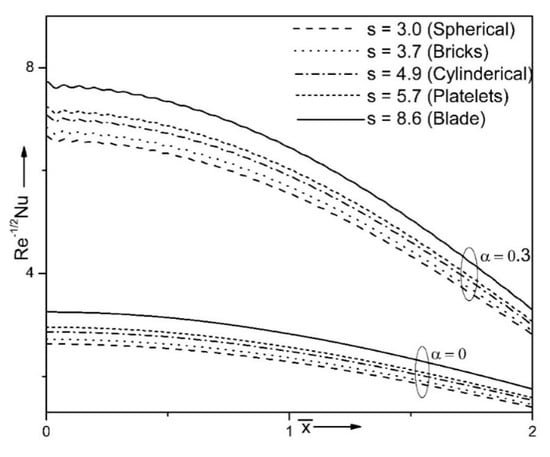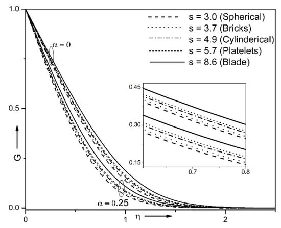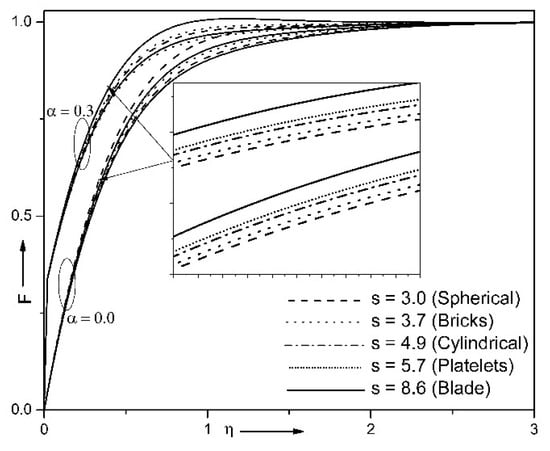 Taking into account an influence of the considered shapes of nanoparticles on velocity profiles (see Figure 15) it is possible to highlight that the blade-shaped particles give the highest growth of the velocity in comparison with other studied shapes, and spherical-shaped particles illustrate the formation of the smallest velocity. Further, a rise of small parameter reflects a growth of the velocity profile.