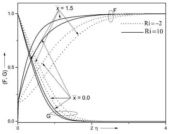 Figure 16 explains the impact of non-similarity parameter and combined convection parameter on velocity distribution and temperature distribution . Velocity profile reduces while, temperature profile boosts in absence of non-similarity variable in opposing buoyancy flow case. Further, opposite outcomes are observed in presence of non-similarity parameter in assisting buoyancy motion case. Reason is that directs as a favorable pressure drop. Intensifying magnitudes of combined convection coefficient augments the velocity distribution while, reduces the temperature distribution. It is clear from figure that the velocity of liquid is more pronounced for larger Ri in assisting motion variant. Physically, more buoyancy force is generated for greater values of Ri, which gave the maximum energy to the moving fluid, and such heat creates the confrontation in the circulation. The opposing model was scrutinized for the velocity in opposing flow version. In addition, it ascertains that the temperature and thermal boundary layer are diminished owing to Ri in the considered circulations.