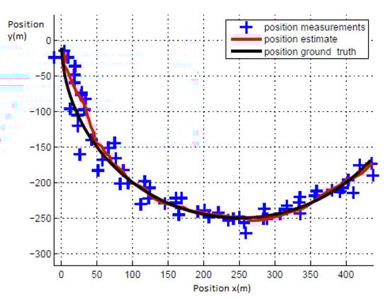 Then, the KF was applied to the synthetic data and estimates of the state of the vehicle were obtained. The results can be seen in Figure 1, in which: