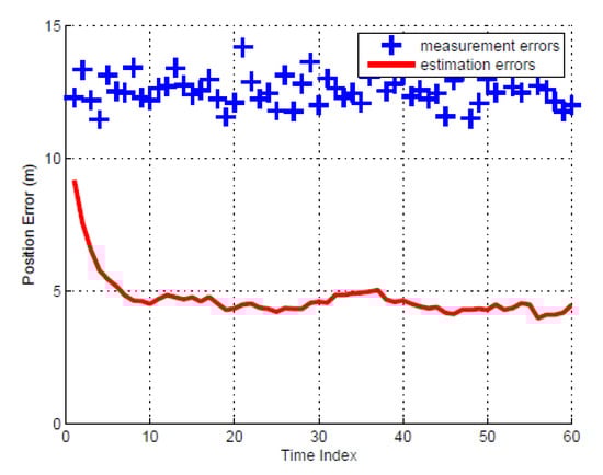 As we can see from the above figure, the estimated trajectory of the vehicle was smoother than the jumping measurements. Figure 2 shows the results of 100 Monte Carlo trials. As we can observe, the measurement errors were larger than the estimated errors, just like in the previous example.