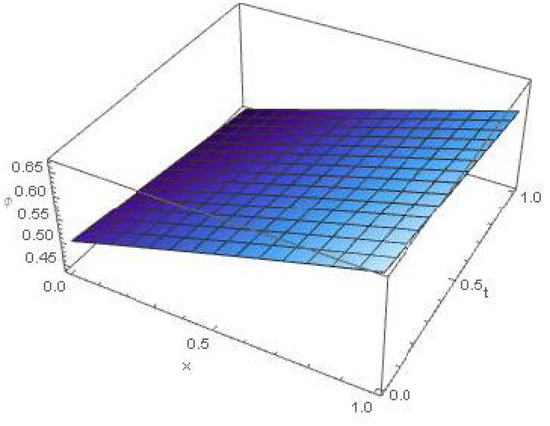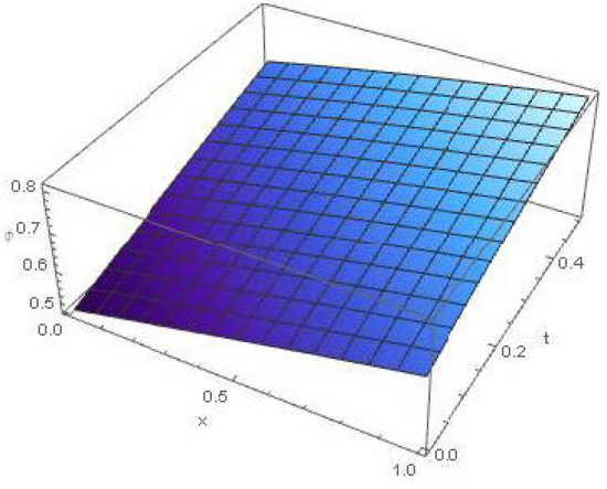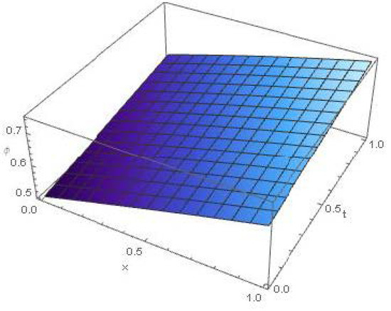 This segment discusses the proposed method’s precision and applicability by comparing the approximate and exact solutions using graphs and tables. Figure 1 and Figure 2, depict the behaviors of the exact solutions of Examples 3 and 4, when . We can observe that the solution increases quickly when we increase x and t.