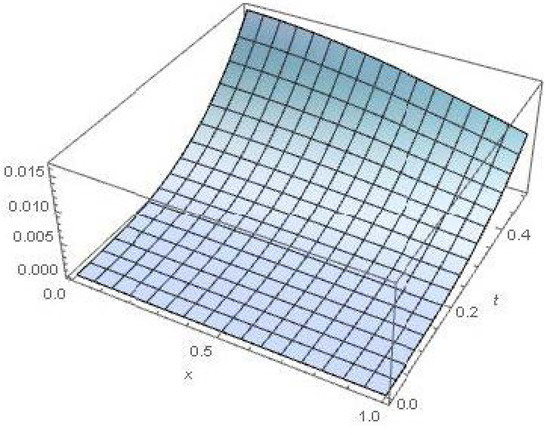Figure 5 and Figure 6, the represent the absolute error between the exact and absolute solution when and belong to [0,1]. These figures reveal that the approximate solutions obtained by CSDM are almost similar to the exact solutions. In both Figure 7 and Figure 8, we present various fractional-order solutions, of Examples 3 and 4, respectively, in two-dimensional space; we observe that the numerical solution becomes close to the exact solution when the fractional values Table 1 and Table 2 provide the comparison of exact and approximate solutions in term of absolute error at , at time in Example 3, and for Example 4, as x increases. In this case we can see that the solution decreases regularly as the fractional values of increases.