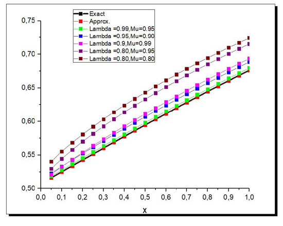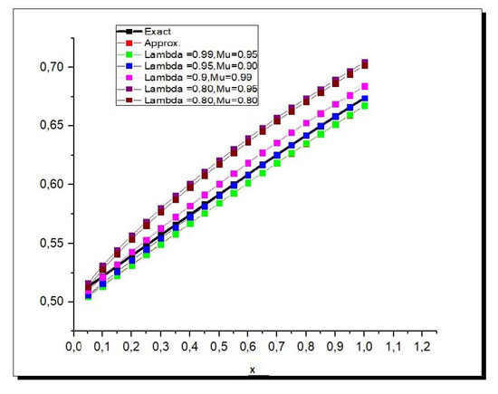 Exact and approximate solutions of , for Example 4, for diverse values of fractional orders , and when .