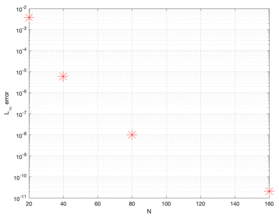 In [30], the authors’ mentioned that the Fourier spectral method provides spectral convergence in the spatial direction, so in order to see whether the method provides spectral convergence to solve Problem 1, we ran the simulations with fixed and for various values of N starting with and captured the results in Figure 1. From Figure 1, we notice that the Fourier spectral method achieves spectral accuracy in the spatial direction.