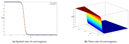 In Figure 2a, the numerical traveling wave solution obtained via the proposed method is compared with the analytical traveling wave solution, and it can be seen that the numerical solution is in good agreement with an exact solution. In Figure 2b, the numerical traveling wave solution is presented with the surface plot.