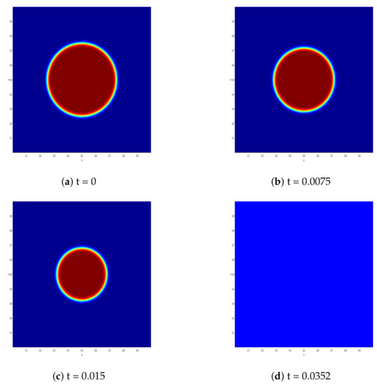 We ran an experiment with the initial radius with the proposed method until time and capture the solution profiles for in Figure 3. As we can see in Figure 3, as time evolves, the radius of the circle shrinks at the rate of curvature of the circle and disappears when time T is larger than . The results in Figure 3 are in good agreement with the theory proposed for the disappearance of the circle for time greater than [33].