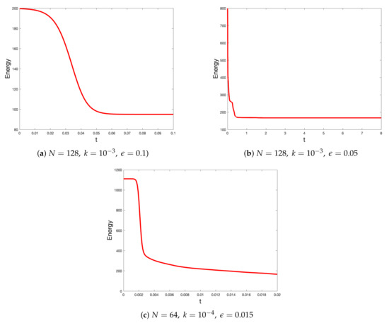 The authors in [14,15,16,20] proposed the operator splitting schemesfor the AC equation. H. G. Lee et al. in [15] proposed a simple and stable second-order operator splitting method by decomposing the original equation into three subequations with the free-energy evolution term, the heat evolution term, and a nonlinear source term. Yibao Li et al. in [16] proposed an unconditionally stable second-order hybrid numerical method for solving the AC equation by decomposing the original equation into linear and nonlinear equations. They used a Crank–Nicolson scheme to discretize the linear equation and used a fast solver to solve the resulting discrete system of equations. They then solved the nonlinear equation analytically. Zhang and Du in [21] studied the performance of numerical approximations to the AC-type diffuse interface models, with a particular focus on their performance in the sharp interface limit and the effectiveness of high-order discretization schemes. They first compared the different spatial discretizations of an energy functional in the diffuse interface framework and analyzed discretizations of the time-dependent equation using various time-stepping schemes and an adaptive finite element spatial approximation. In [22,23,24], the authors studied various nonlinear equations for numerical solutions using iterative methods. Gottlieb and Wang in [25] analyzed the stability and convergence of the Fourier pseudospectral method coupled with a variety of specially designed time-stepping methods of up to fourth-order, for the numerical solution of a three-dimensional viscous Burgers’ equation. The long-time stability properties of a few multi-step time discretization schemes with the Fourier pseudospectral method for the two-dimensional incompressible Navier–Stokes equations were studied in [26]. In [27], Chen et al. discussed the long-time energy stability and error analysis of higher order linear exponential time differential (ETD) multi-step methods for gradient flows based on the energy method. A second-order energy stable BDFnumerical scheme was proposed in [28] to solve the Cahn–Hilliard equation.