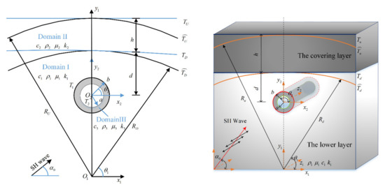 In recent decades, while the use of underground space by humans has increased, underground tunnels have been used extensively in infrastructure. There are many types of urban underground tunnels, including water supply, drainage, gas, heat, electricity, communications, radio and television, industry, etc. The seismic waves will be dispersed as they spread to the ground and the outer and inner surface of the tunnel. Under the superposition of incident waves and these scattered waves, dynamic stress concentration will occur around the tunnel, which can cause damage to the tunnel structure [1]. However, the traditional concept is that underground structures are safe during earthquakes. It was not until the Kobe earthquake in Japan and the Wenchuan earthquake in China, both of which caused severe damage to underground structures, that concerns were raised about the seismic resistance of underground structures [2,3]. Hence, the need to study the seismic resistance of tunnel engineering. In order to understand and reveal the influence of seismic waves on underground structures, researchers have carried out a lot of research work on seismic wave scattering using numerical methods [4,5,6] and analytical methods [7,8,9]. Although numerical methods are more suitable for solving complex and realistic configurations, analytical solutions have inherent meaning, not only revealing the physical process of wave scattering but also serving as a benchmark for calibrating numerical results. Since Baron used the integral transformation method and the wave function expansion method to give the analytical solution of the cylindrical cavity to the compression wave pulse scattering problem, the wave function expansion method has become the main analysis method to study the wave scattering problem [10]. So far, whether in the field of traditional seismic research or in the field of smart materials, the wave function expansion method has played an important role [11,12,13,14,15].