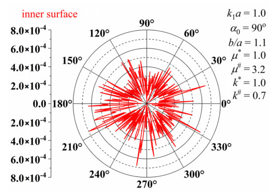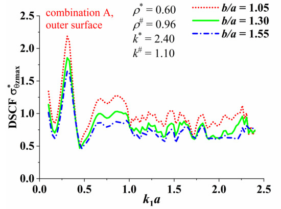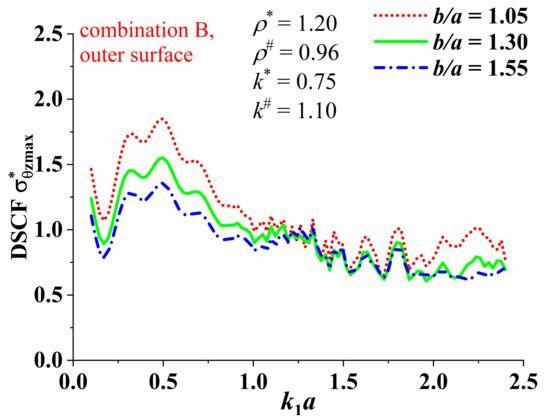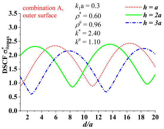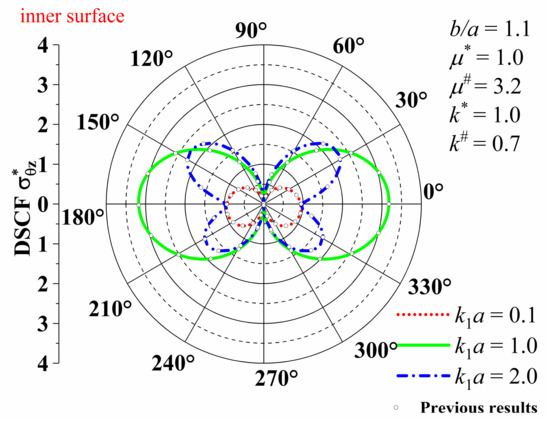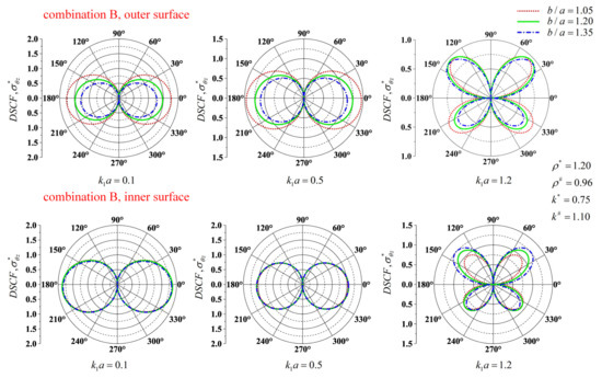 The stresses at or near the boundary of the lining can be significantly phantom under the disturbance of SH waves. For this kind of problem, the dynamic stress concentration factor is usually used to reflect the degree of stress concentration. The dynamic stress concentration around the lining can cause a brittle fracture or fatigue cracking, and understanding the dynamic stress distribution around the liner can be of great help to the structural design. In reference [25], the dynamic stress concentration factor () is defined as the ratio of the hoop stress to the incident wave stress amplitude: