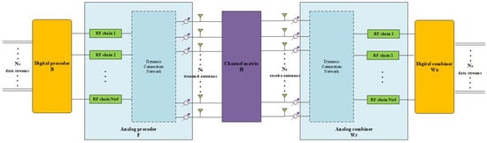 If the analog precoder F is given, the effective channel can be determined, and the digital precoder B can be obtained through traditional SVD decomposition. The design of the analog precoder is related to the precoding structure used. The dynamic sub-connected structure used in this article on the transmit side is shown in Figure 1. The dynamic connection network in the Figure 1 is the core of this structure, which is realized by a switch network. The switches dynamically allocate the transmit antennas connected to different phase shifters to the RF link. The switch has smaller power consumption than the phase shifter, although it would generate a certain insertion loss. However, reference [] shows that the implementation of switch-based hybrid precoding is a promising solution after simulation verification. In the dynamic connection network, each RF chain in the analog precoding process is connected to a non-empty and non-repetitive subset of the transmitting antenna . represents the set of transmit antennas connected to the j-th RF chain. For example, if the i-th transmit antenna is connected to the j-th RF chain, then . Therefore, the constraint for designing the analog precoding matrix can be written as []:
