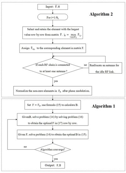 We use an alternating minimization method to decompose problem (14) into two sub-problems alternately: given analog precoder F, design digital precoder B; given digital precoder B, design analog precoder F. We do this iteratively until the value of the objective function of problem (14) increases compa with the previous iteration, then the analog and digital precoder obtained in the previous iteration will be taken as the optimal solution. The specific iteration process is as follows: