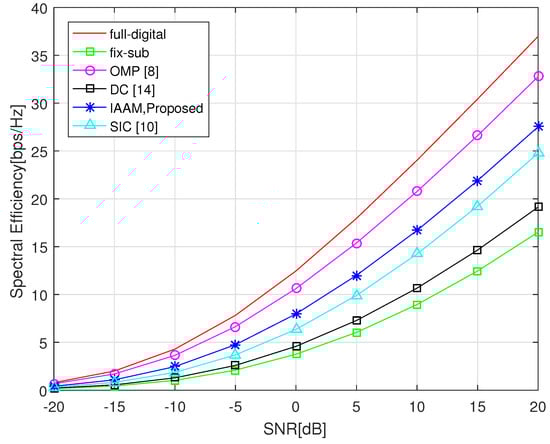 The quantification results given in Table 2 are based on = 4. Additionally, from Figure 5, we know that the value of in the complexity of IAAM algorithm is 8, and it will decrease with the increase in . As the value of is always very large, the OMP algorithm has the largest computational complexity in the table. The proposed IAAM algorithm has the same magnitude of computational complexity as the SIC algorithm. The complexity of the DC algorithm is the lowest, while its performance is the lowest too. The quantification results also show that the spectral efficiency performance of the proposed algorithm is at least 17.5% higher than the existing two traditional sub-connected algorithms, and it increases at least about 12.8% energy efficiency, compa with the OMP algorithm, even when = 4.