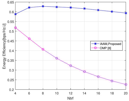 Figure 4 shows a comparison between the proposed IAAM algorithm and the fully-connected based OMP algorithm with the changes in the number of RF chains (). In terms of sub-connected structure, according to Formula (23), both and have nothing to do with , while they both increase linearly with in the fully connected structure. Therefore, as increases, the energy consumption of the fully-connected structure increases much faster than that of the sub-connected structure, which means the denominator in Formula (22) increases faster, and because the spectral efficiency(SE) of OMP algorithm is already close to the full-digital precoding, according to Figure 3, the increase in the RF chains only brings about a little increase in spectral efficiency, which is the numerator in Formula (22), thus leading to a continuous drop in its energy efficiency(EE). While the spectral efficiency of the proposed IAAM algorithm increases rapidly with at first, but the increase slows down after the number of RF chains exceeds 8, thus its energy efficiency experiences a slight increase at first. Later, it also decreases with the increase in , but because its overall energy consumption increases slower than the fully-connected structure, its overall energy efficiency declines slower than the fully-connected based OMP algorithm. It can be seen from Figure 4 that the energy efficiency of the proposed sub-connection-based IAAM algorithm is much higher than that of the fully-connected OMP algorithm, and the performance gap gradually expands with the increase in .