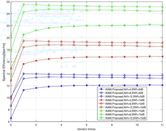 Since the proposed IAAM algorithm needs to be processed in two steps: Algorithms 1 and 2, and Algorithm 1 involves alternating minimization, the convergence speed is also worthy of attention. Figure 5 shows the simulation result of the spectral efficiency of the IAAM algorithm under three different and three different SNR with iteration times. When increases, the result of Formula (20) will be closer to the optimal [], which makes the performance of the initial value calculated by Algorithm 2 more effective. An excellent initial value can naturally uce the iteration times requi for convergence. It can be seen from Figure 5 that that, regardless of SNR = 5, 10, 15 dB, when = 4, 8, and 12, the numbers of iterations requi for convergence are about 8, 4, and 2, respectively, indicating that the larger , the lower the algorithm’s time complexity, and the better the spectral efficiency performance. Additionally, combined with the conclusion of the energy efficiency simulation result in Figure 4, it can be concluded that this scheme is very practical when the number of RF chains is large, and the energy efficiency is higher than that of the fully-connected hybrid precoding and the algorithm complexity is also low.