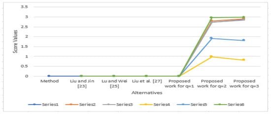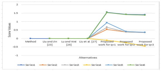 We then use the graphical representations for Table 4, Table 5 and Table 6. The graphical representations for Table 4, Table 5 and Table 6 are shown in Figure 2, Figure 3 and Figure 4, respectively. From these figures, it is clear that they contains six series, which express the family of alternatives with different colors. The best alternative in Figure 2 is A A L 1 and the best alternative in Figure 3 and Figure 4 is A A L 6 . It is seen that the proposed approach is superior and more effective than these existing methods [21,22,23].
