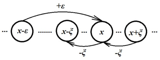Let us record the value of the current time as , where h is the step number of transitions between states (the process of transition between states becomes quasi-continuous with an infinitely small-time interval τ), h = 0, 1, …, N. The current stateat step h, after transition at step may be increased by some value ε or decreased by value ξ, and, accordingly, be equal to − ε or .