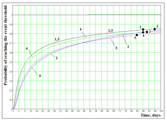 Taking into account that on the day of implementation, the probability of a predicted event is 1, then the forecast accuracy can be estimated by calculating the value of the relative error η% (using the values of the probabilities of realization at a given time point of the predicted (Pp) and random events (Pr): .