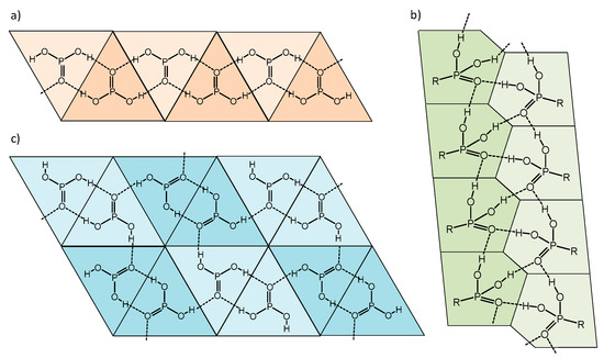 There are several papers in which the structure of self-associates of phosphonic acids, RP(O)(OH)2, are discussed. In the crystalline state, phosphonic acids form infinite ladder-like “double H-bonded” [34,35] or “triple H-bonded” chains [36], or two-dimensional sheets (see Figure 1a–c, respectively) [37]. Judging from these structural motifs, one could conclude that the presence of two OH groups, their relative orientation in the P(O)(OH)2 moiety, as well as the strong tendency of the P=O group to form two hydrogen bonds place phosphonic acids as versatile and underexplored synthons for the design of H-bonded molecular crystals [38,39]. In disordered environments, the structure of phosphonic acid self-associates are less known. For example, phenylphosphonic acid encapsulated in mesoporous silica (SBA-15 and aminopropyl-modified SBA-15) forms an amorphous state between liquid and solid with unknown structure, as the crystallinity is broken by the confinement [40]. The ability of phosphonic acids to form extended hydrogen-bonded networks has several industrial applications. For example, in proton conducting polymer membranes, phosphonic acid moieties presumably form H-bonded chains of various lengths and structures, which serve as a path for the long-range proton transfer (Grotthuss mechanism) [41,42,43]. Phosphonic acid-based organic and organic–inorganic coatings are used as alternative surface treatments for aluminum [44] and titanium [45,46]. Self-assembled monolayers (SAMs) of phosphonic acid-based molecules are commonly used to modify the surface of dielectrics [47,48,49].
