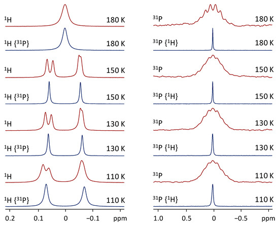 Figure 3 shows the low-temperature (180–110 K) 1H, 1H{31P}, 31P, and 31P{1H} NMR spectra of a sample containing tert-butylphosphonic acid dissolved in a CDF3/CDF2Cl mixture. For visual clarity, the signals are centered at 0 ppm to compensate for the temperature dependence of chemical shifts (ca. 0.014 ppm per 10 K in 1H NMR spectra and ca. 0.07 ppm per 10 K in 31P spectra; the non-centered signals are shown in Figure S1 in Supplementary Information). This temperature dependence reflects a slight shortening of hydrogen bonds upon decrease of temperature; in turn, the hydrogen bond shortening is caused by an increase of the dielectric constant of the solvent, which is typical for freonic gases and their mixtures [60].