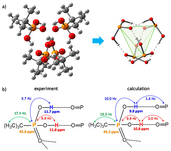 (a) Optimized (B3LYP/6-311++G(d,p)) structure of tetramer of tert-butylphosphonic acid in vacuum: (left) the complete structure, and (right) the same structure in which the tert-butyl groups have been omitted for clarity. (b) The values of chemical shifts and coupling constants calculated for the tetramer of tert-butylphosphonic acid.