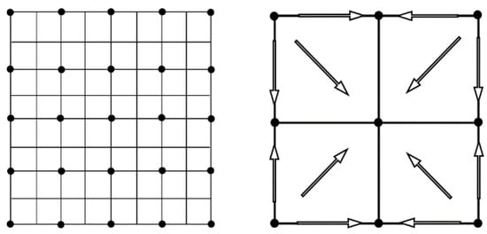 According to the difference dispersion condition, large scale of grid can also satisfy the dispersion condition when the low frequency is used, which means that the number of spatial discrete points can be reduced as well as the computational complexity. So the frequency multiscale propagation can be combined with grid multiscale inversion, as shown in Figure 1. The idea of grid multiscale method [34] is to divide the model parameters into several grids of different scales, and the problem is solved sequentially from coarse grids (large scale) to fine grids (small scale). The inversion results for the coarse grid are interpolated and continue to be used as an initial model for finer grids. The finest grid is determined from the source frequency and calculation precision. Usually, the method for getting coarse grids is to take two times the previous grid size as the sampling operator (Figure 2, left); and the method for getting fine grids, is to simply take the mean value of four corners as the interpolation operator (Figure 2, right).