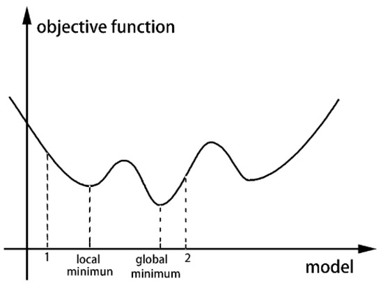 In theory, nonlinear waveform inversion is difficult because there are many local minimums in the objective function. These local minimums will obstruct the search for the global minimum, and the inversion method will only converge to minimum values that are the nearest to the initial data, as shown in Figure 3.