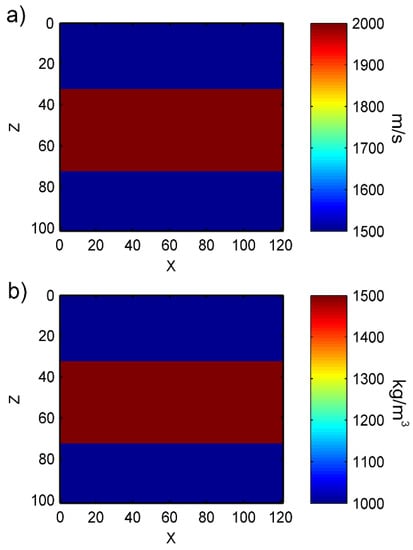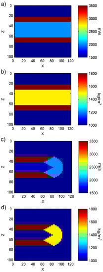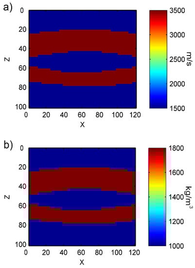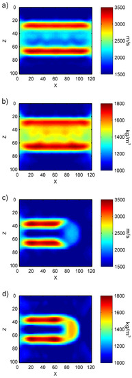 For the elastic wave Equation (1), assuming a perturbations of model parameter cause a perturbation of displacement . Define the adjoint wave field which is adopted by propagating the residual data from the receiver positions backwards through the elastic medium. Then the gradient for Lame parameters , and density can be written as [30]: