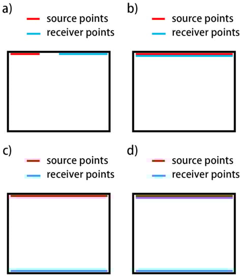 Figure 9 shows a few distribution modes for sources and receivers. In (a), the 20 sources are uniformly distributed on the 0–40 mm on red line at the left of the top of the model, and the spacing is 2 mm. The 60 receivers are uniformly located at the 60–120 mm blue line at the right of the top, and the spacing is 1 mm. In (b), the 20 sources are uniformly distributed on the red line at the top, and the spacing is 6 mm. The 60 receivers are uniformly located on the blue line at the top, and the spacing is 2 mm. The red and blue lines coincide. In (c), the 20 sources are uniformly distributed on the red line at the top and the spacing is 6 mm. The 60 receivers are uniformly located on the blue line at the bottom, and the spacing is 2 mm. In (d), the 20 sources are uniformly distributed on the red line at the top, and the spacing is 6 mm. 30 receivers are uniformly located on the blue line at the top, while the rest 30 receivers are uniformly located on the blue line at the bottom, the spacing is 4 mm.